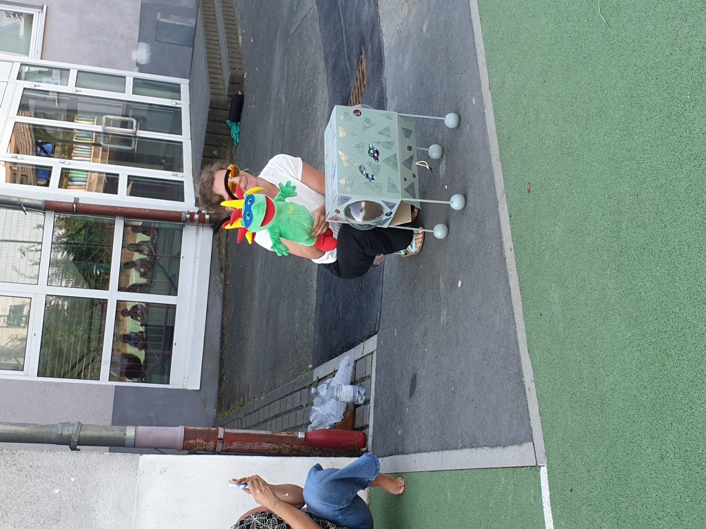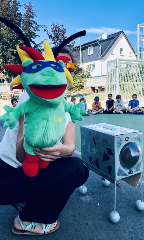 In der 1. Schulwoche passierte etwas einmaliges, außerirdisches auf dem Schulhof in der Ringstraße. Nach einer kurzen Nachricht an die Klassenlehrerinnen des Jahrgangs 1, versammelten sich die Kinder auf dem Fußballfeld. Kosmische Geräusche ertönten und aus der Ferne schwebte ein Raumschiff heran! Wer steckt da drinnen? Wer kommt zu uns? Alle Kinder warteten gespannt und mit großen Augen. Nachdem das Raumschiff landete, kletterte der kleine grüne Lubo heraus und wunderte sich sehr, wo er gelandet war. Nach der ersten Begrüßung, wurde schnell klar, dass Lubo sich auf der Erde noch kein bisschen auskennt. Daher verabredete er sich, von nun an ganz regelmäßig einmal pro Woche in die 1. Klassen zu kommen, um die Kinder auf der Erde kennenzulernen und zu erfahren, wie die Menschen auf der Erde friedlich und freundlich miteinander leben.