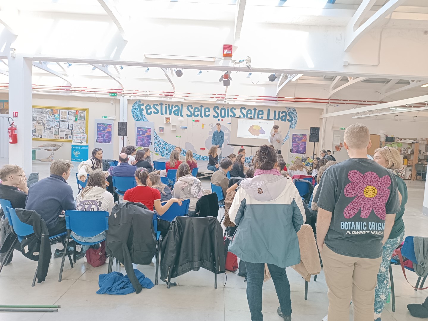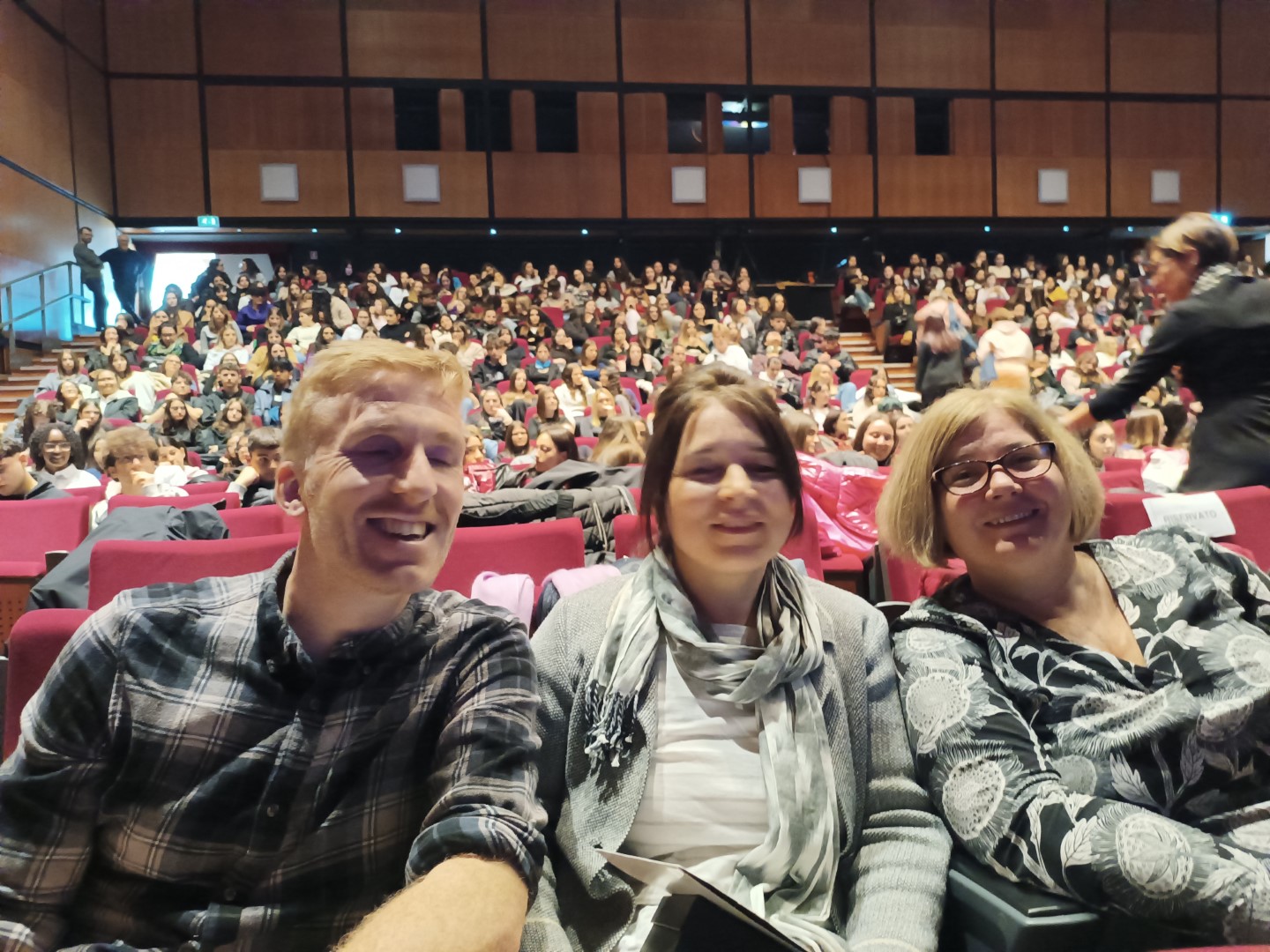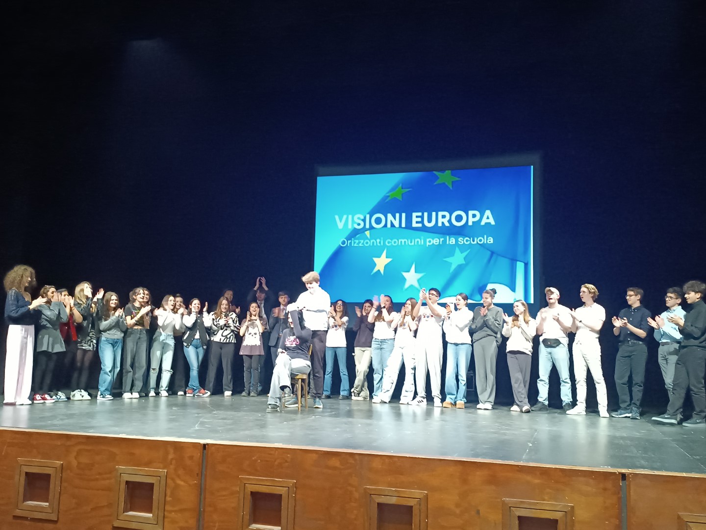 Eine große Herausforderung für alle nationalen Gruppen war die Vorstellung der eigenen Schule auf einer Theaterbühne vor über 500 zuschauenden italienischen Schülern und Lehrern. Aber auch das haben Till Tewes Becker, Tia Becker, Silia Pust und Anton Rickert mit Bravour gemeistert. Chapeau für euren Einsatz.“