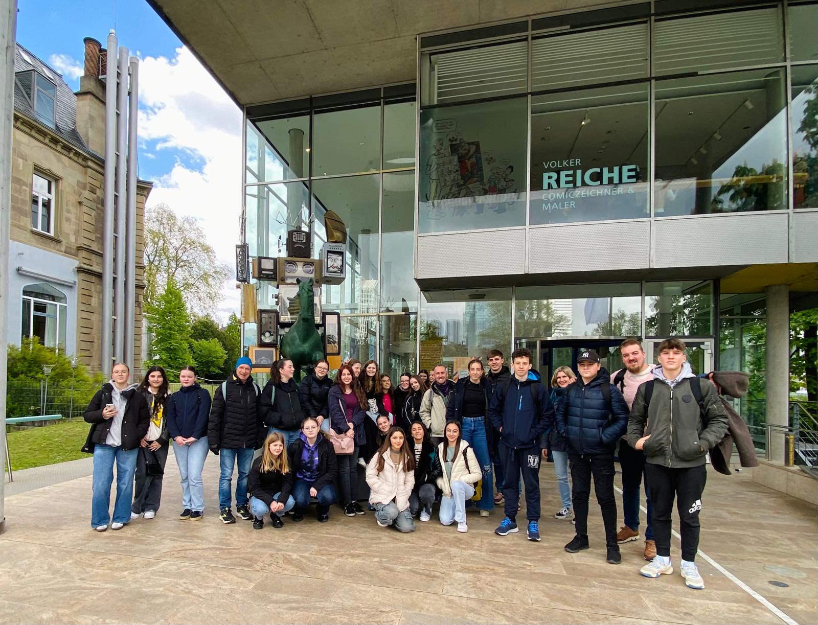 Vorab jedoch stand die Gruppe selbst im Fokus: Durch Spiele lernten sie sich näher kennen und auch die Gebäude der Europaschule wurden erkundet. Im Anschluss fand der erste inhaltliche Austausch über das Thema in Form von vorbereiteten Präsentationen über KI (Künstliche Intelligenz) sowie Technologien der Zukunft statt. Am Folgetag besuchten die Schülerinnen und Schüler die Physik der Marburger Universität. Hier erwarteten sie spannende Workshops des Schüler:innen Forschungszentrums, in denen unter anderem Lego-Roboter gebaut wurden. Die schöne Stadt Marburg mit ihren Sehenswürdigkeiten wurde im Anschluss im Rahmen einer Stadtführung, welche die Schülerinnen und Schüler aus Gladenbach vorbereitet hatten, erkundet. Im Frankfurter Museum für Kommunikation beschäftigte sich die Gruppe am Mittwoch mit „Fake News“. Dazu überprüften sie vorab ihr Gespür im Hinblick auf Falschmeldungen, bevor sie im Anschluss selbst einmal „Fake News“ erstellen durften. Eindrücke aus der Stadt Frankfurt sammelten die Schülerinnen und Schüler in der daran anschließenden Freizeit.