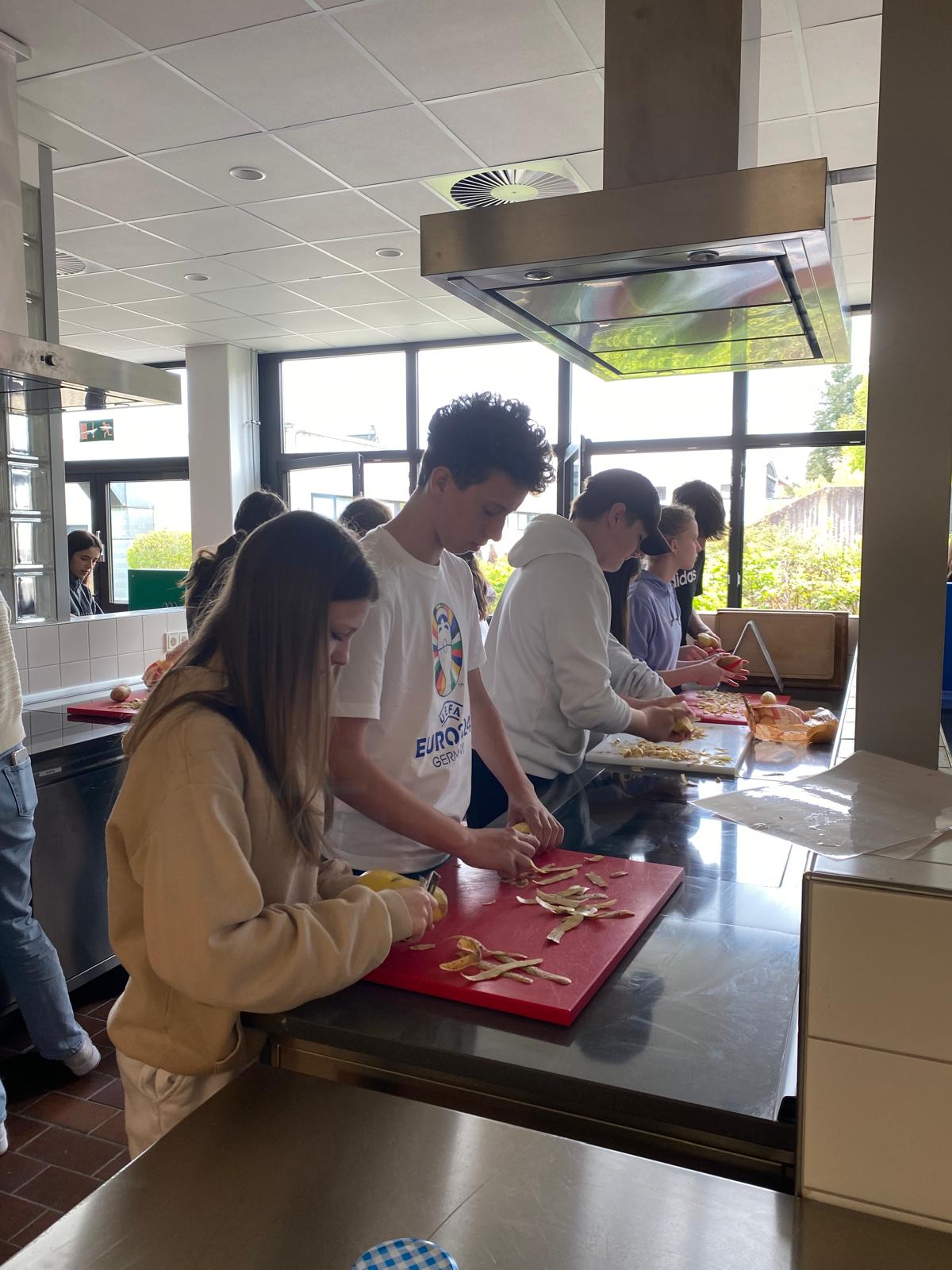 Am letzten Schultag erhielten die Schülerinnen und Schüler ihre Erasmus-Zertifikate. In der Kultur und Sporthalle stand mit ausgiebigen Volleyball-Spielen anschließend viel Bewegung auf dem Programm. Der aufkommende Hunger wurde durch gemeinsames Kochen vertrieben. Die Schülerinnen und Schüler der Europaschule haben sich für Kartoffelpuffer, Kräuterquark, Rote Grütze und Vanillesoße entschieden.