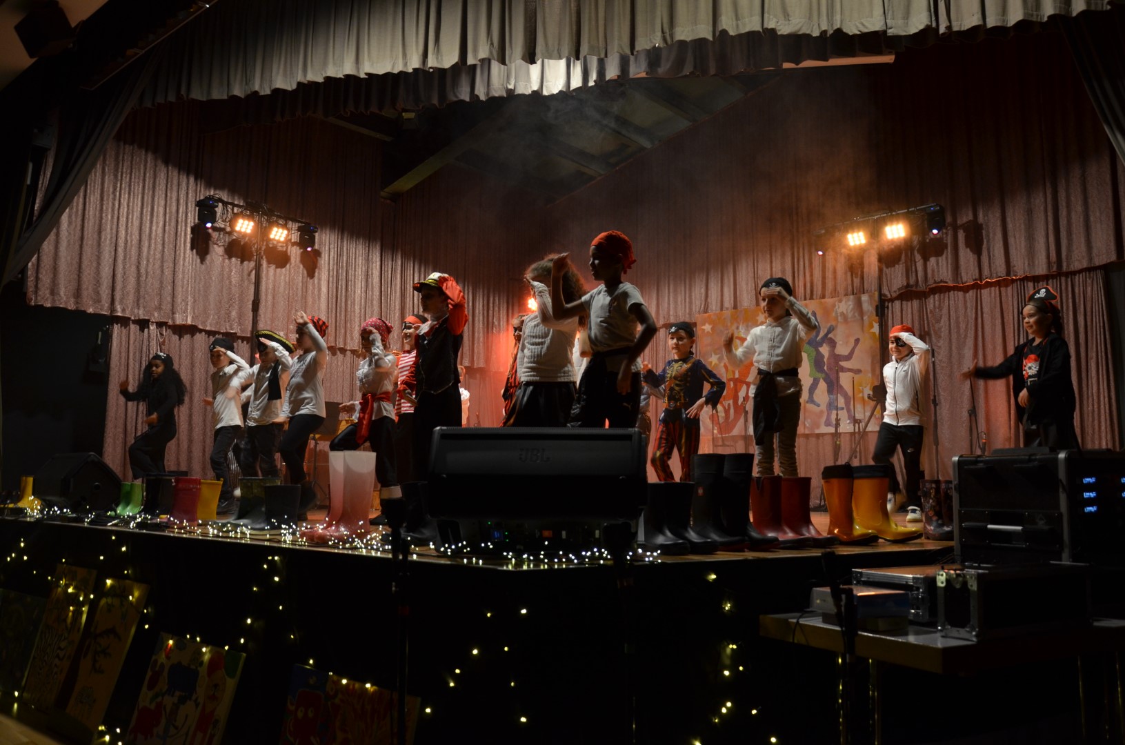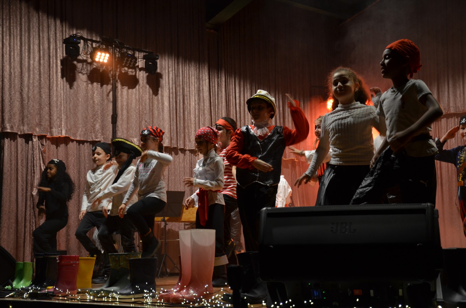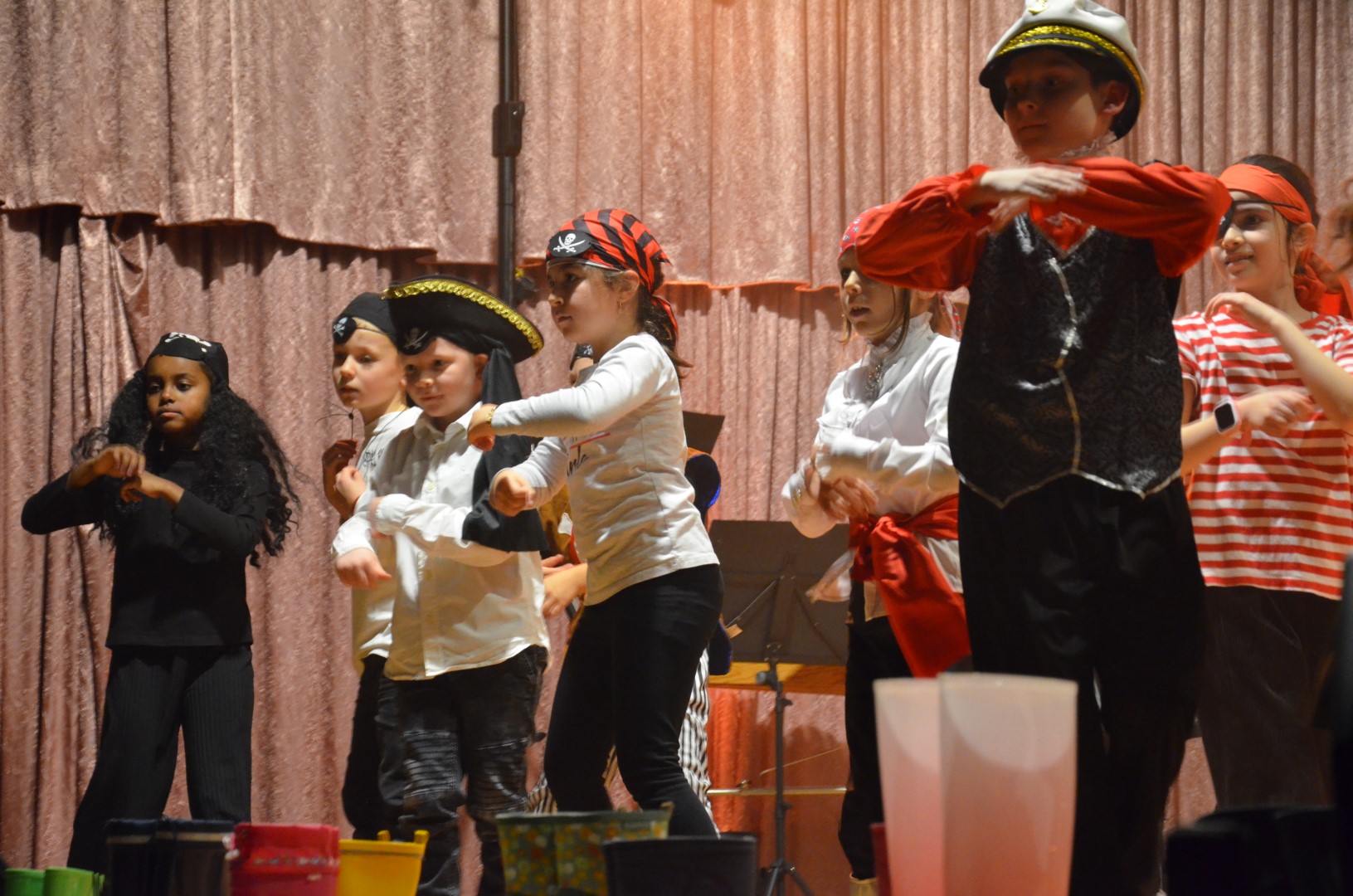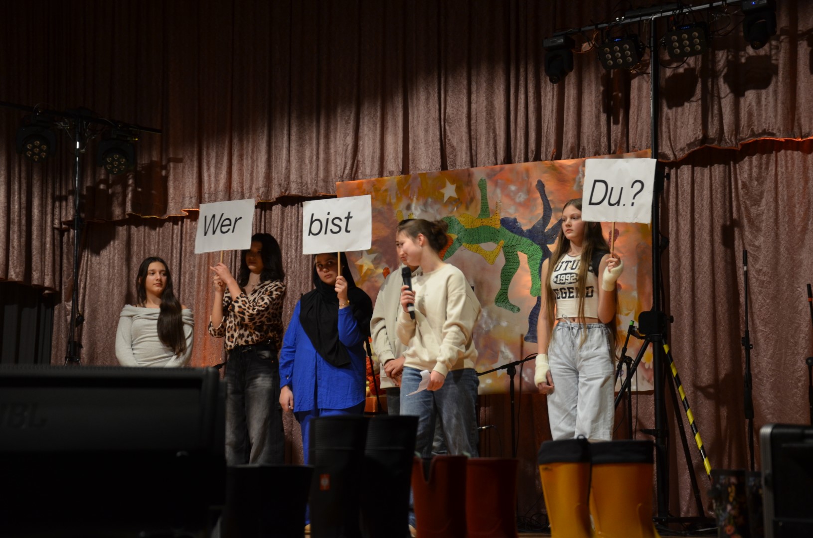 Frau Placzek-Ouaissa gestaltete hierzu gemeinsam mit dem Arbeitskreis „Kulturelle Bildung“ und den beteiligten Lehrkräften und AG-Leiterinnen und Leitern ein buntes und vielfältiges Programm aus Tanz, Musik, Unterrichtsprodukten, Schauspiel, Sketch und Kunst. Doch nicht nur das Angebot war breit gefächert, als Gesamtschule von Klasse 1 bis Klasse 13 waren auch auf der Bühne von der Grundschule bis zur IKL-Klasse und weiter zur Oberstufe viele Altersstufen und Schulzweige vertreten. Piratinnen und Piraten traten auf, es wurde in Gummistiefeln getanzt, Romeos und Julias berühmte Balkonszene inszeniert, gleichzeitig getanzt, gesteppt und getrommelt, über die eigene Identität nachgedacht sowie beeindruckend Saxophon und weitere Instrumente gespielt.