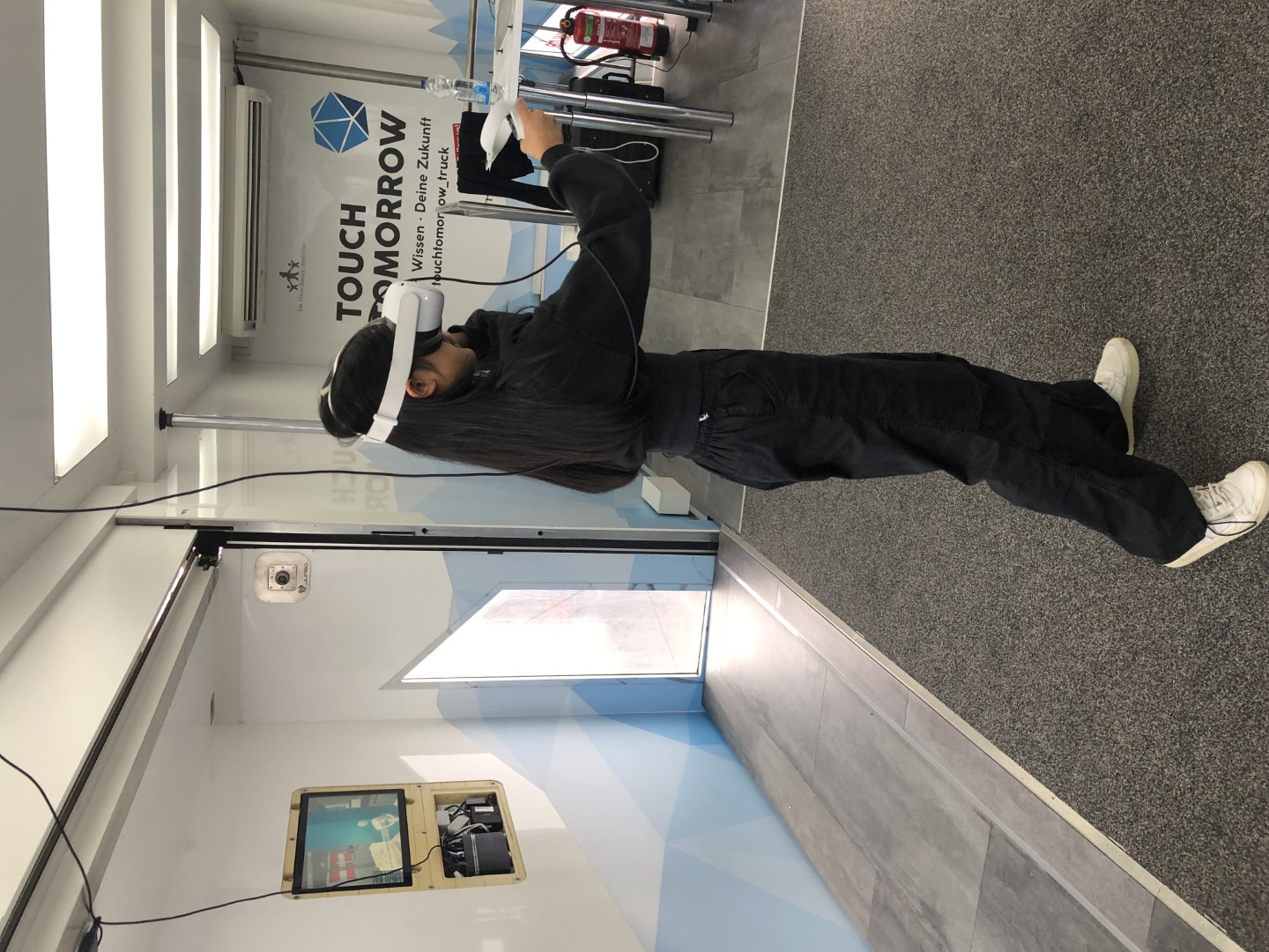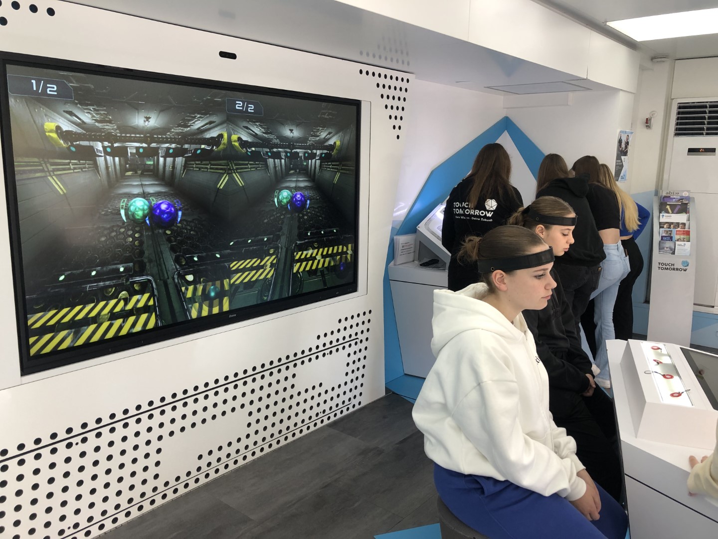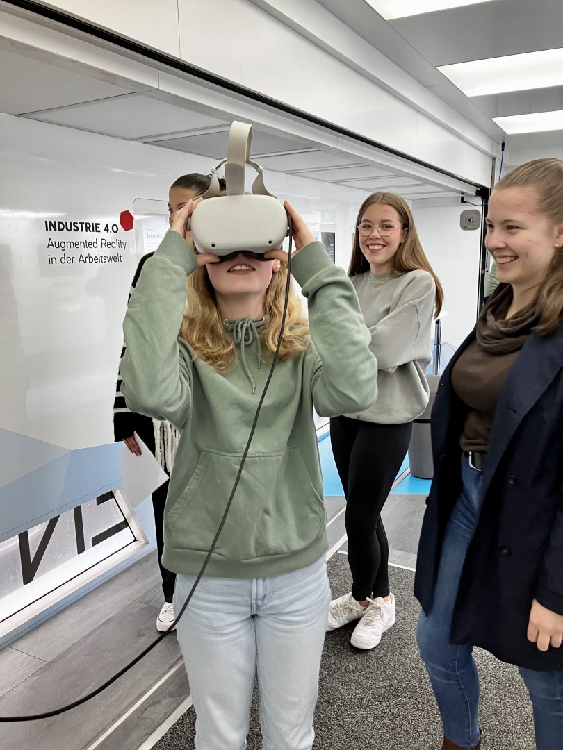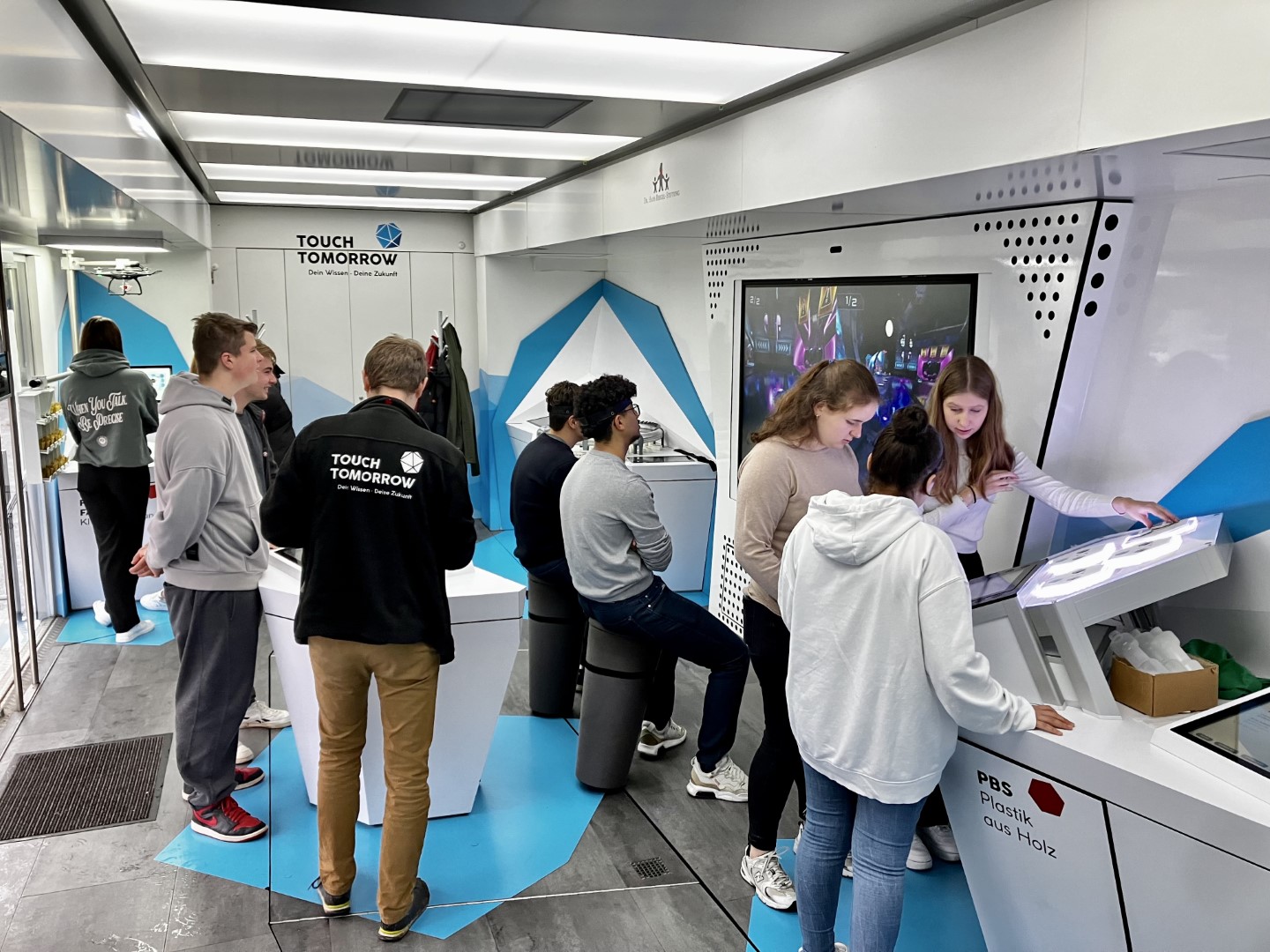 Vom 30.10.-02.11.23 hatten Schülerinnen und Schüler der 8. bis 11. Klassen Gelegenheit, im „TouchTomorrow-Truck“ die MINT-Welt von morgen kennenzulernen. Angeleitet von speziell geschulten MINT-Coaches (allesamt Naturwissenschaftler:innen) arbeiteten die Schüler:innen in Kleingruppen an verschiedenen Stationen aus Naturwissenschaft und Technik, die zeigten, was bereits in der heutigen, aber vor allem in der zukünftigen Lebens- und Arbeitswelt möglich ist. Neben einer Station, an der mittels Gedankensteuerung eine Bowlingkugel beschleunigt wurde, konnten die Schüler:innen u.a. einen Roboter programmieren oder das Arbeiten im virtuellen Raum erproben. MINT zum Anfassen als außerschulischer Lernort auf dem eigenen Schulhof – eine tolle Gelegenheit für Lernende (und Lehrende)! Der ausfahrbare Truck schafft es auf zwei Etagen für MINT zu begeistern und berufliche Perspektiven zu eröffnen, sowohl für ein mögliches Studium als auch eine passende Ausbildung. Unterstützt werden sie dabei von Berufsberater:innen. Insbesondere für Schulen im ländlicheren Raum, die keinen schnellen Zugriff auf Museen und weitere außerschulische Lernorte haben, ist der TouchTomorrow-Truck eine tolle Gelegenheit in die Welt von morgen einzutauchen.