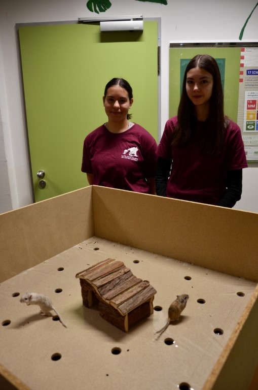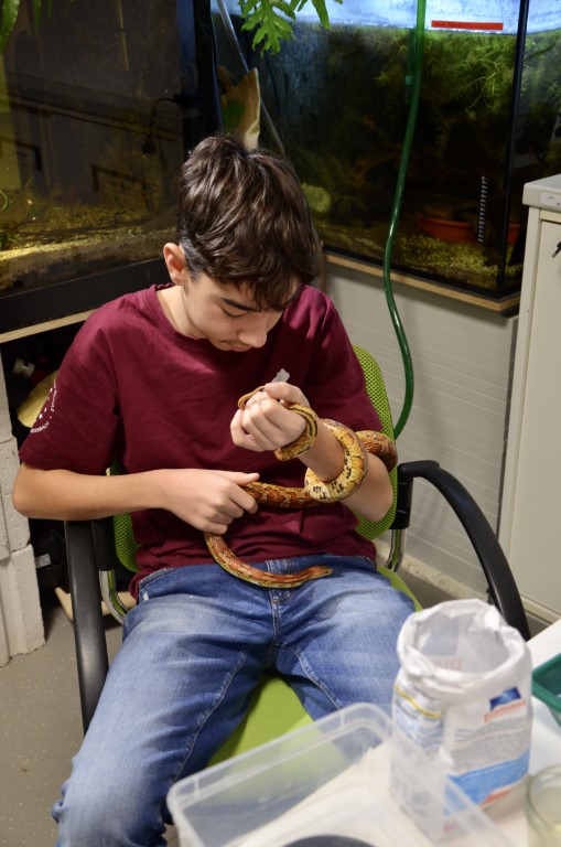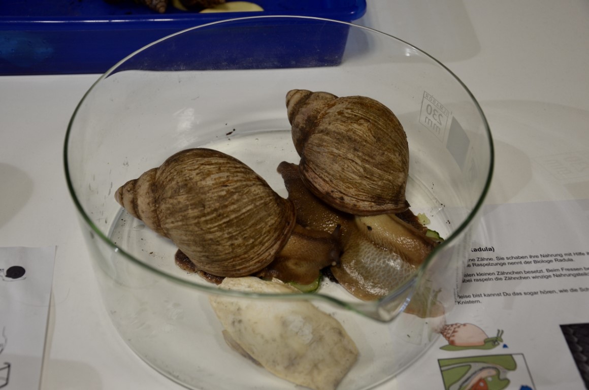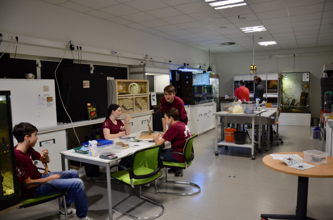 Mit Hilfe eines vielseitigen Programms stellte sich die Schule aus verschiedenen Blickwinkeln vor. Herr Dr. Schmenk gab bereits bei der Eröffnung des Tages und der Begrüßung der Gäste einen kurzen Überblick. Freiwillige Schülerinnen und Schüler der ESG boten im Anschluss Schulführungen an und begleiteten Eltern und Kinder beim Erkunden des Schulgebäudes und der vielfältigen Angebote: Die Naturwissenschaften der Chemie und Physik begeisterten etwa mit vielen Experimenten zum Staunen und Anfassen, die Aquarien-AG stellte das neue Zuhause der Zebrabuntbarsche vor, die Geographie-Fachschaft präsentierte Lernprodukte aus dem Geographieunterricht, die überwiegend von Schülerinnen und Schülern erstellt wurden. Ein besonderer Zuschauermagnet war auch in diesem Jahr wieder das Vivarium mit seinen vielen Tieren und Pflanzen. Die Schülerinnen und Schüler der Vivarium-AG zeigten hier Vogelspinnen, Schlangen, Geckos, Axolotl, Wüstenrennmäuse, Riesenschnecken und vieles mehr – und glänzten dabei mit fachkundigem Wissen über die vielen Tiere und ihre Gewohnheiten. Wer sich traute, durfte viele dieser zum Teil ungewöhnlichen, zum Teil niedlichen, in jedem Falle aber faszinierenden Lebewesen sogar anfassen und füttern.